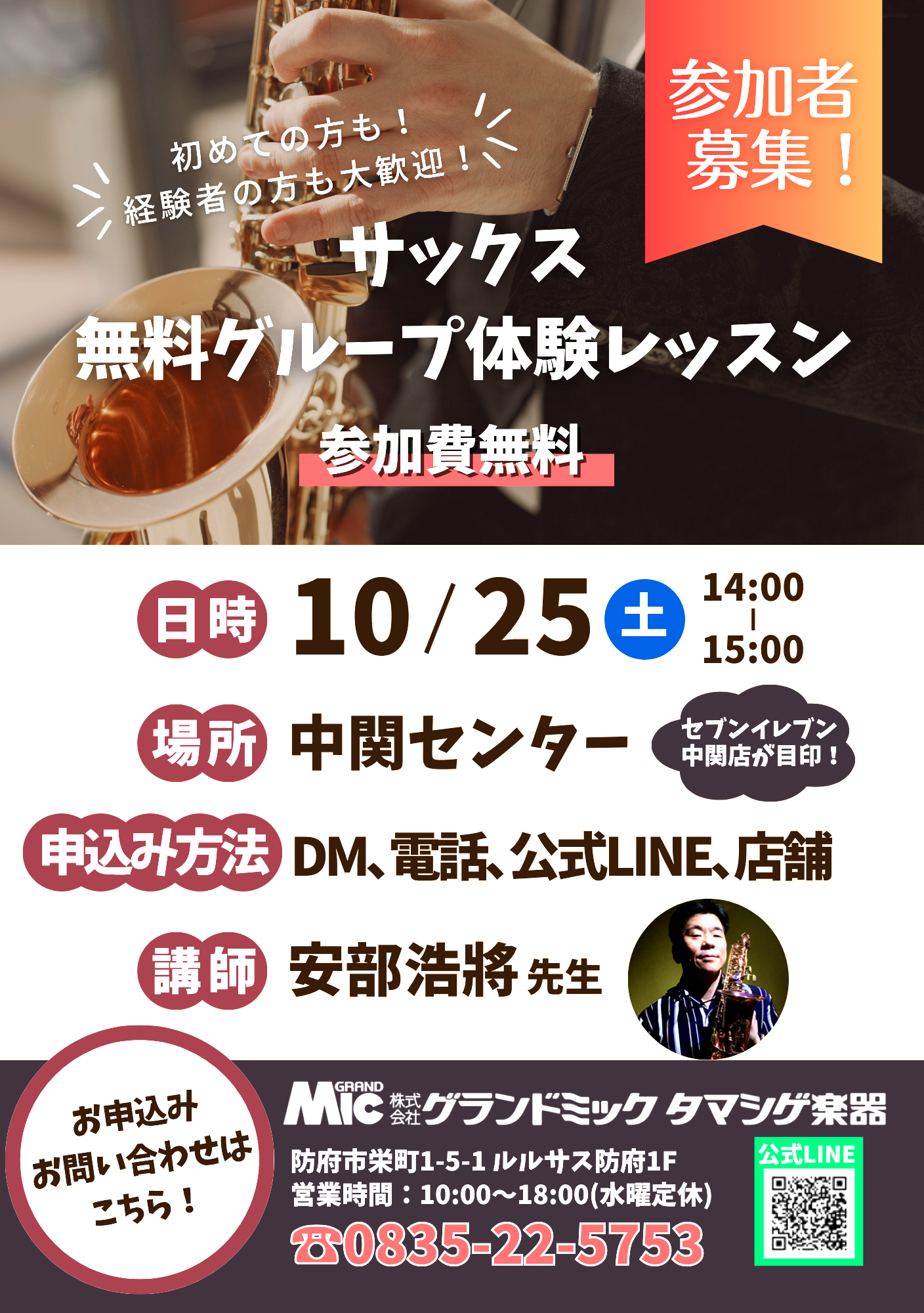 [タマシゲ楽器]SAX無料グループ体験レッスンのお知らせ🎷🎵